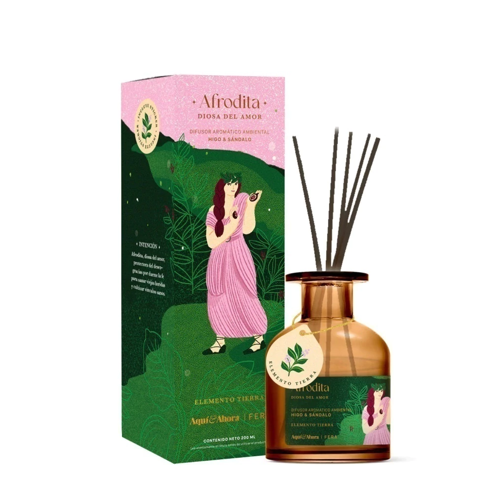 Difusor Afrodita, diosa del amor. Higo & sándalo, fragancia dulce y amaderada. Afrodita es la diosa del amor y la belleza. Proviene de la mitología griega. Afrodita nació de una concha marina esbelta y rebosante de placer. La leyenda cuenta que se gestó por sí misma a partir de la espuma del mar y los genitales de Urano (que había sido castrado por su hijo Saturno, y los había arrojado al agua). Se la reconoce por la libertad con la que vivió sus vínculos afectivos. Junto con Marte tuvieron al dios Cupido, famoso por sus flechazos de amor. Le podemos pedir que nos brinde abundancia para cultivar vínculos sanos y crear proyectos fértiles. Pertenece al elemento Tierra (de los signos Tauro, Virgo y Capricornio). Se trata de una energía enraizada y de disfrute que nos impulsa a activar nuestros sentidos. Ceremonia de Magas es una colección para hacer de tu casa, un ritual. Este difusor viene con un sticker de su elemento e incluye un QR para descargar más info esotérica. __ Duración estimada: entre 45 y 60 días, según las condiciones del ambiente. Elaborado por laboratorio certificado. Incluye caja y varillas: 7,5x23,5 cm Envase de vidrio ámbar Contenido: 200 ml