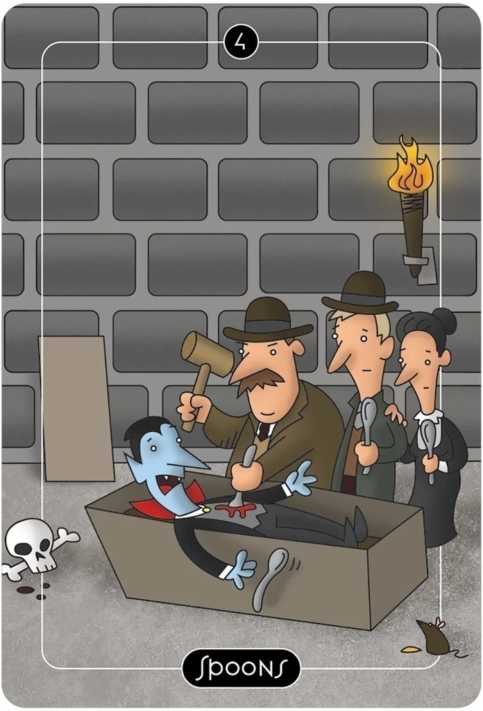 El dibujante de cómics Adam Stoller le da un toque humorístico al tarot tradicional con coloridas ilustraciones de estilo caricatura y símbolos y figuras reinventados. Los cuatro palos de los Arcanos Menores se han transformado en Cucharas, Globos, Cubos y Escobas. Los lectores de tarot disfrutarán buscando significados traviesos y correspondencias divertidas en esta encantadora baraja de bolsillo en lata. Incluye 78 cartas y un folleto de 64 páginas.